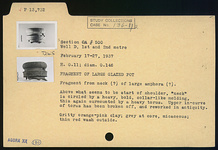 | Description: | Fragment from neck(?) of a large amphora(?). Above what seems to be start of shoulder, "neck" is circled by a heavy, bold, collar-like moulding, this again surmounted by a heavy torus. Upper incurve of torus has been broken off and reworked in antiquity. Gritty orange-pink clay; gray at core, micaceous; thin red wash outside. | |