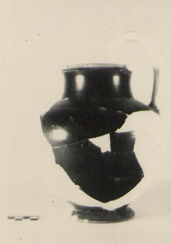| Description: | Much of walls, most of handle with upper attachment missing; restored in plaster. Base and body do not actually join, but profile certain. Squat high-shouldered body; low flaring echinus foot; broad low neck slightly concave; round mouth with narrow horizontal rim. Double handle. Reserved: underside and edge of foot, top of rim. Traces of two purple lines around outer face of lip and also on inside of neck(?). Fine buff clay slightly pinkish; good black glaze outside and on inside of neck. | |