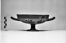 | Description: | Mended from many pieces; a small bit of the slightly offset rim and of the outer edge of the base preserved. Restored in plaster. Decoration similar to P 1371, but with black dots within the interlacing lines, and dots of white(?) and accessory red on the palmettes. Two circles on center inside. High plain stem; flaring foot with thin beveled edge; underside unglazed. ADDENDA P 1371: Reserved, outside: handle zone, top of stem underneath, the resting surface and outer edge of foot, narrow band below handle zone; inside: a line just within the edge of the rim, the center with small glazed circle. Handle zone decorated with palmettes. | |
