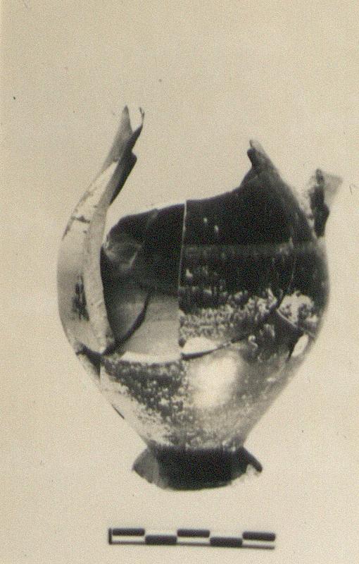 Description:   Mouth, most of neck, parts of wall and most of handle missing. Small solid flaring foot. The single handle starts well down on shoulder. Body tapers sharply to base; wide neck. Underside of foot reserved. Single purple band below handle.