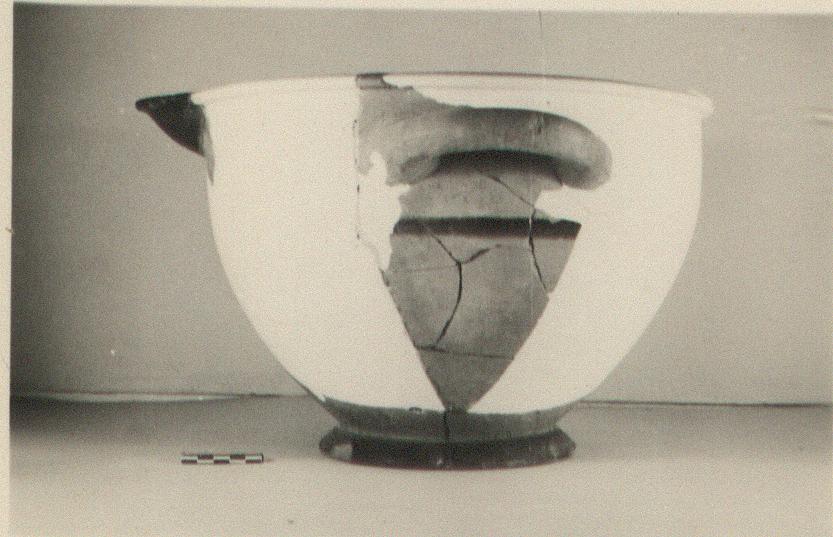 | Description: | Foot and part of lower wall, with a small part of the upper wall, a bit of the rim, and one handle preserved; restored in plaster. Profile apparently complete. The spout fragment does not join. Low heavy flaring foot; deep body; rim nearly flat on top, turned slightly down; heavy horizontal handles well below rim. Spoon-shaped spout. Pinkish-buff clay; fair glaze; red for whole of inside and rim; blacker on spout, band below handle and inside of foot. | |