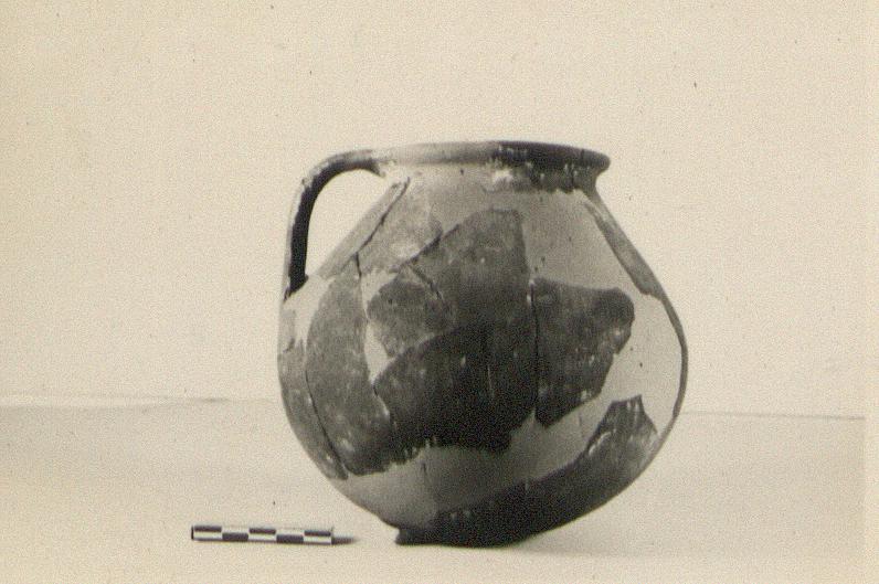 | Description: | Many wall fragments missing; restored in plaster. Round-bottomed, round-bodied; slightly flaring lip; handle, shoulder to lip. Reddish micaceous clay, much fire-blackened; handmade. Addendum 2023: Aeginetan (AE) | |