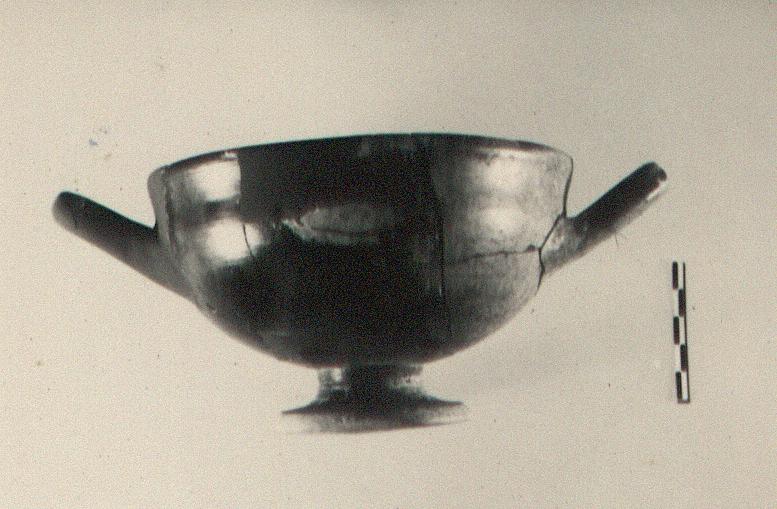 | Description: | One handle and part of wall and much of rim missing; restored in plaster. A deep cup, the rim only slightly offset. A low moulding at top of stem. The foot has a bevelled outer edge and broad resting surface. Purple on moulding at top of stem. Reserved: the bearing surface of the foot, and outer edge. Pinkish-buff clay; black glaze mostly fired greenish. Note wear at two sides of foot and at corresponding points on wall and lip. | |