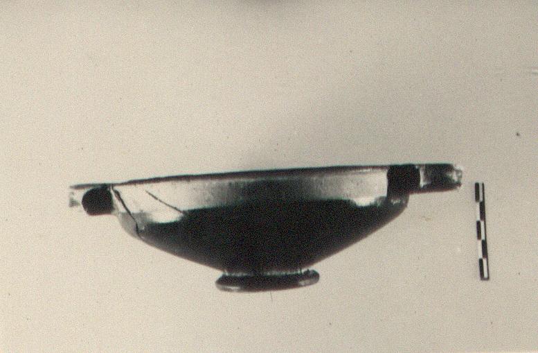 | Description: | Fragments of wall and rim missing; restored in plaster. Small low flaring foot, concave below; plain slightly projecting lip, flat on top. Horned horizontal handles at lip. Reserved: handle zone, underside of foot; broad circle in center inside. Pinkish-buff clay; black glaze. | |
