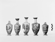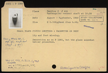 | Description: | Lip and foot missing. Decoration as on P 1381, but the glaze somewhat better preserved. ADDENDA P 1381: Four large palmettes on front of body not centerd to handle; on the shoulder degenerate lotus pattern; short strokes around the base of the neck. | |