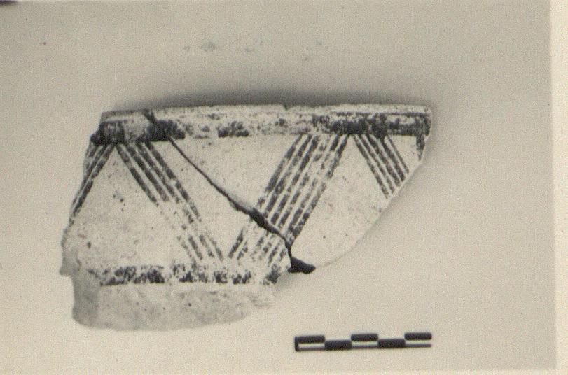 | Description: | Fragment from rim and wall of a large open vessel with mouth curving slightly in. Flat slightly projecting lip. Gritty buff or pinkish-buff clay; buff slip with horizontal bands and cross-hatchings in matte paint outside. | |