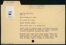 | Description: | From lower wall of a closed pot. Lower side of figured panel with skirt and feet of a woman dancing or running, right; a garland crosses diagonally beneath her feet. A bit of some object, in part white, at lower left. Red band at upper edge of black, on lower wall. Pinkish-buff clay; good black glaze; white for woman's feet, red dots on her dress. | |