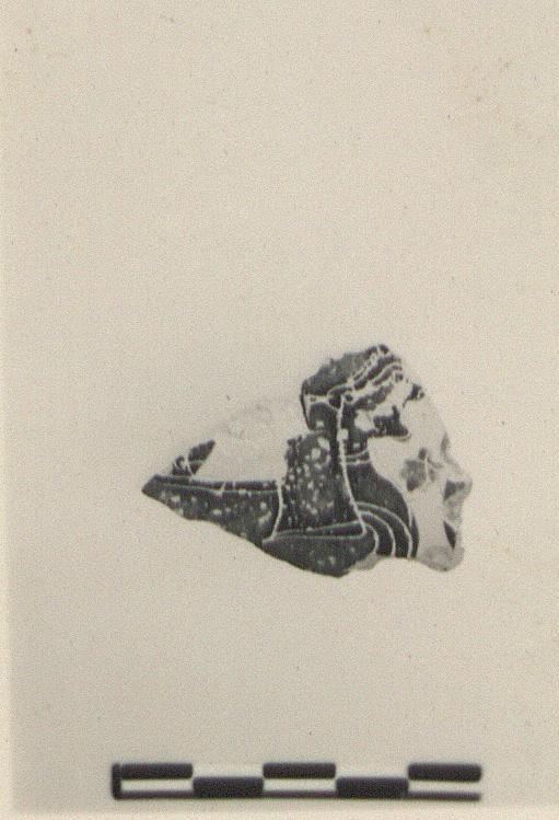 | Description: | From the shoulder of a small closed pot. Most of head, shoulder, and part of wing of sphinx or siren, right. Purple for hair and wing. Incision throughout. Pinkish-buff clay. | |