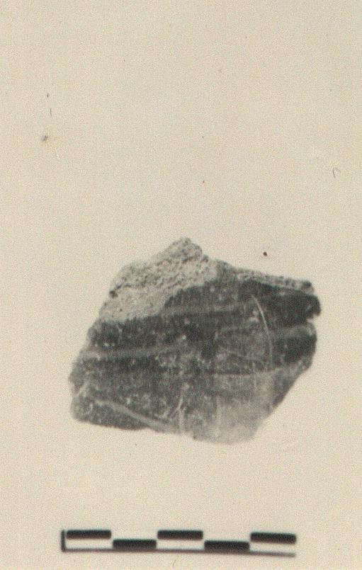 | Description: | Apparently from the wall of a round-bodied bowl. Gritty brown clay, largely fired gray; burnished slip, eggplant purple outside with striped decoration; black and inferior inside. | |