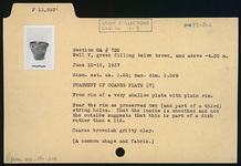 | Description: | From the rim of a very shallow plate with plain rim. Near the rim as preserved two (and part of a third) string holes. That the inside is smoothed and not the outside suggests that this is part of a dish rather than a lid. Coarse brownish gritty clay. | |