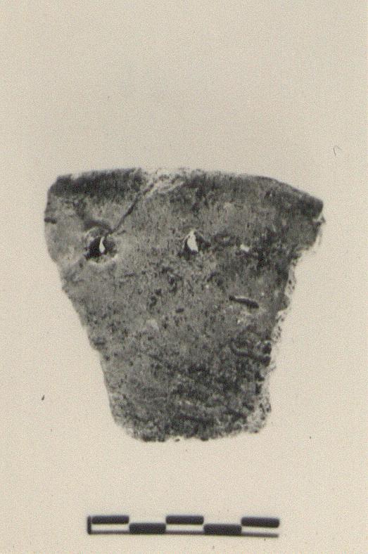 | Description: | From the rim of a very shallow plate with plain rim. Near the rim as preserved two (and part of a third) string holes. That the inside is smoothed and not the outside suggests that this is part of a dish rather than a lid. Coarse brownish gritty clay. | |