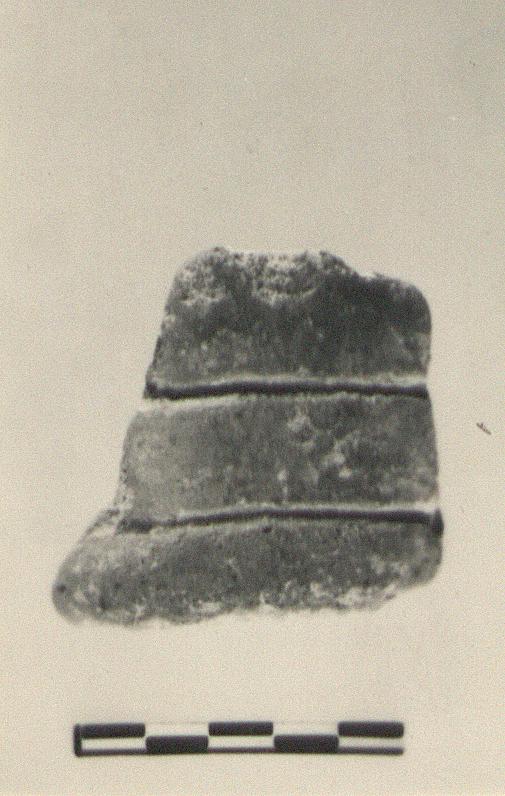 | Description: | Fragment apparently preserves the full height of a high foot ring or stand. Two horizontal grooves around outside. Gritty brown clay, gray at core; burnished red slip outside. | |