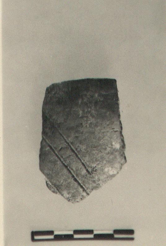 | Description: | Fragment from plain lip and wall of open bowl, the wall decorated with diagonal incisions fading out toward top. Brown clay, largely fired gray; there is certainly brownish red slip inside, probably also outside. | |