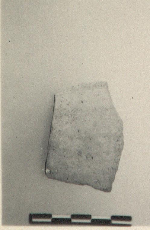 | Description: | From plain lip and wall of an open bowl. Hard gritty clay, light gray at core, pinkish at surface. Whitish or light buff slip; a band of black paint at lip, inside and out. | |