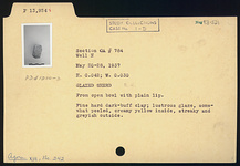 | Description: | From an open bowl with plain lip. Fine hard dark buff clay; lustrous glaze, somewhat peeled, creamy yellow inside, streaky and grayish outside. | |