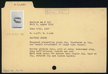 | Description: | Fragment preserving plain lip, flattened on top, and handle attachment of large open vessel. Matte dark paint for narrow band inside lip, band on lip, outside lip and inside handle. Gritty pinkish clay, gray at core; burnished slip, deep buff, inside and out. | |
