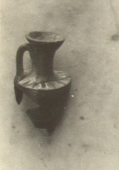 | Description: | Mended from two pieces; the base and a large part of the sides missing. Neck and shoulder reserved; on the latter, dots and rays, the latter alternating black and white. Just below the shoulder, two narrow bands showing the stain of a vanished color; a third further down on the body. Probably once red. Cf. Agora XII, no. 1116. | |
