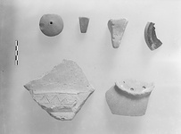 | Description: | A single fragment preserves somewhat less than half the low ring foot and some of the side wall. In the bottom, within the circle of the foot, are some very neatly made holes, ca. 0.006 in diameter. Two are completely preserved, two partially. These were probably originally seven, a center one and a circle of six around it. The fabric is exactly that of the "handmade" water jars (cf. P 14074, Ψ 753). Cf. Agora XII, no. 1648. | |