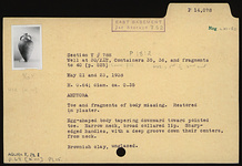 | Description: | Toe and fragments of body missing; restored in plaster. Egg-shaped body tapering downward toward pointed toe; narrow neck; broad collared lip; sharp-edged handles, with a deep groove down their centers, from neck. Brownish clay. Unglazed. | |