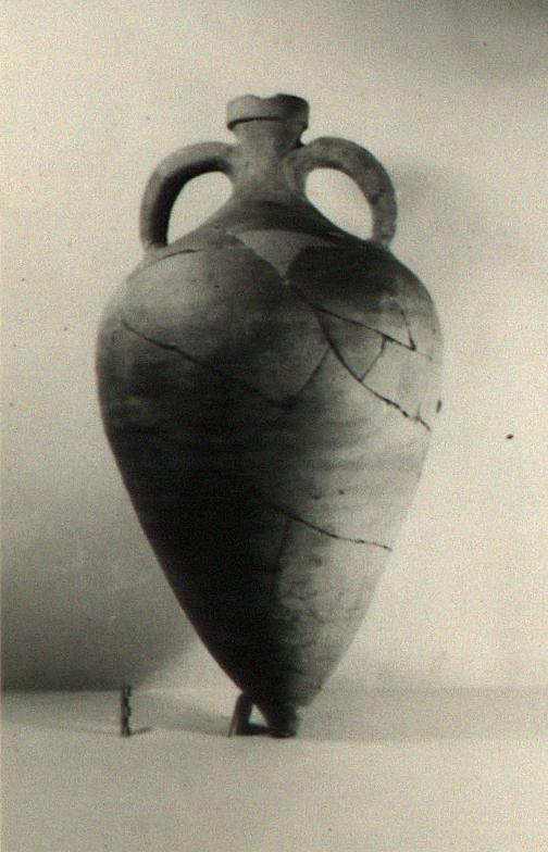 | Description: | Toe and fragments of body missing; restored in plaster. Egg-shaped body tapering downward toward pointed toe; narrow neck; broad collared lip; sharp-edged handles, with a deep groove down their centers, from neck. Brownish clay. Unglazed. | |