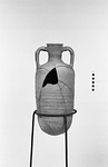 Description:   Fragments of body missing; restored in plaster. Rounded bottom; more or less cylindrical body with irregular horizontal ribbing; rolled lip; roughly ridged handles from below lip.