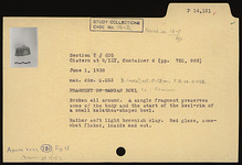 | Description: | Broken all around. A single fragment preserves some of the body and the start of the keel-rim of a small kalathos-shaped Samian bowl. Rather soft light brownish clay. Red glaze, somewhat flaked, inside and out. | |