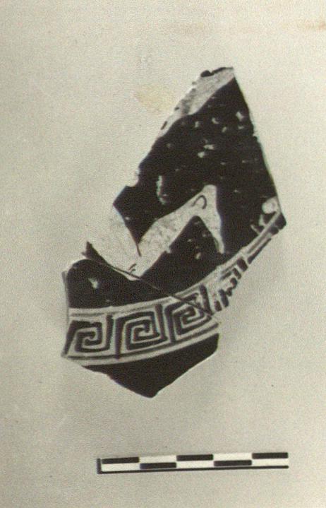 | Description: | Part of floor preserved. Inside: a border of maeander and a running figure, left, right leg with sharply bent knee and edge of left leg preserved. Outside: palmettes and scrolls. Relief contour for toes and lower line of thigh. Buff clay. Fair black glaze. | |