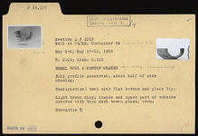| Description: | Full profile preserved; about half of side missing. Hemispherical bowl with flat bottom and plain lip. Light brown clay. Inside and upper part of outside covered with thin dark brown glaze, worn. Possibly non-Attic. | |