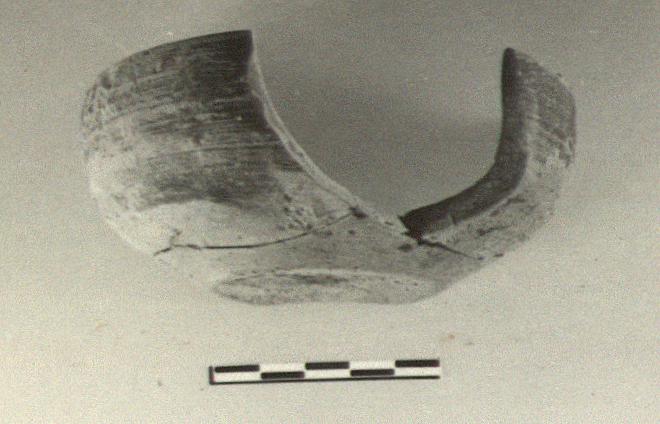 | Description: | Full profile preserved; about half of side missing. Hemispherical bowl with flat bottom and plain lip. Light brown clay. Inside and upper part of outside covered with thin dark brown glaze, worn. Possibly non-Attic. | |