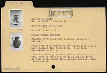 Description:   Fragment of lip and body missing. Restored in plaster. Plump body with continuous curve from base to lip; large cabbage-like trefoil lip; ring foot; band handle from lip.