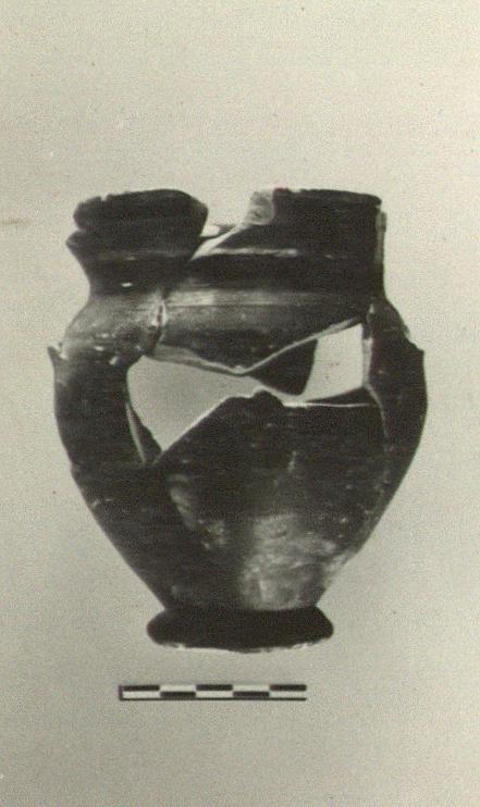 | Description: | Both handles and some pieces of side missing. Ovoid body; ridge between neck and plain thickened lip; plain base ring. Rather poor black glaze. | |