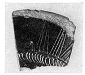 | Description: | Small fragment from floor; ring foot broken away. Incised on floor, near center, tongues; then a narrow band of half circles and a row of tall thin rays and triangles. Excellent glaze; reserved bands on underside. [Sherds stored in B 140-142: T 143] | |