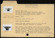 | Context: | Section and provenience uncertain; found in mending room, summer 1933, probably from Section A, Rectangular Rock Cut Shaft. | |