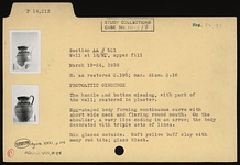 | Description: | The handle and bottom missing, with part of the wall; restored in plaster. Egg-shaped body forming continuous curve with short wide neck and flaring round mouth. On the shoulder, a wavy line ending in an arrow; the body decorated with triple sets of lines. Rim glazed outside. Soft yellow buff clay with many red bits; glaze black. | |