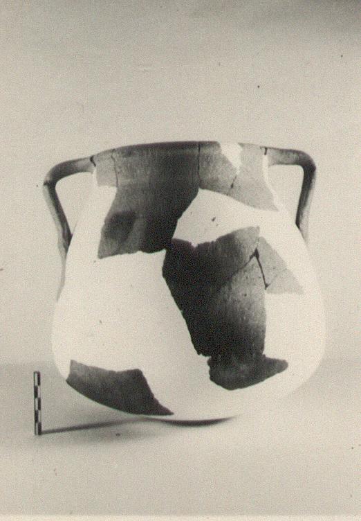 | Description: | Fragments of wall and rim missing; restored in plaster. Deep round-bodied basin with round bottom and straight rim, slightly thickened at the lip; two vertical band handles, shoulder to lip. Cooking ware fabric; traces of burning outside. | |