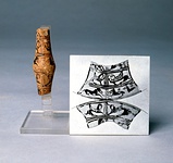 | Description: | Fragment from a handle; double concave shape, probably the handle from a large lid. Broken at both ends. Decoration in zones, heraldic to a central line of alternating guilloche and zigzags. In the upper zone horses' feet; next sphinxes with uplifted paws; next horses; next sphinxes; lowest probably a horse. Buff clay, lustrous glaze. | |