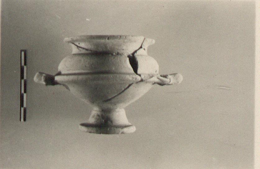 | Description: | Chips missing from rim and keel. Deep body on conical foot; ribbon handles applied to the keel with a hole beside each handle junction. Out-turned lip flat on top. Soft buff clay; traces of white paint. | |