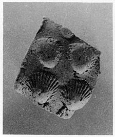 Description:   From lower side wall. Above a row of leaves, of which only tips preserved, three rows of shells.