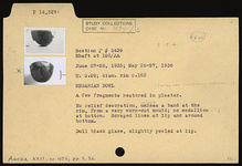 Description:   A few fragments restored in plaster. No relief decoration, except a band at the rim; from a very worn mould; no medallion at bottom. Scraped lines at lip and around bottom.