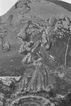 | Description: | Preserved to the lower edge of the rim band. In the medallion a rosette, surrounded by a scraped line and a ring of small leaves. The moulded scene repeated three times; large draped female figure, right, hurling a corpse down on a nude figure which attacks, using an implement with a handle-knob at one end, with an eagle or a vulture perched on the other [Zeus, Ganymede and Eagle]. Winged figures in the field. Slightly metallic black glaze. | |