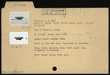 | Description: | Part of rim and wall restored in plaster. Ring foot; shallow body with plain rim, slightly inturned. Thin black glaze over all. | |