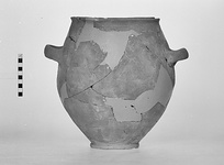 | Description: | Parts of rim, wall and foot missing; restored in plaster. Ring foot and deep rounded body; low point of greatest circumference. No neck; wide mouth with slightly projecting rim, flanged inside to hold lid. Horizontal band handles set well down; two grooves in the handle zone. Brownish red clay; unglazed; the surface very much worn. | |