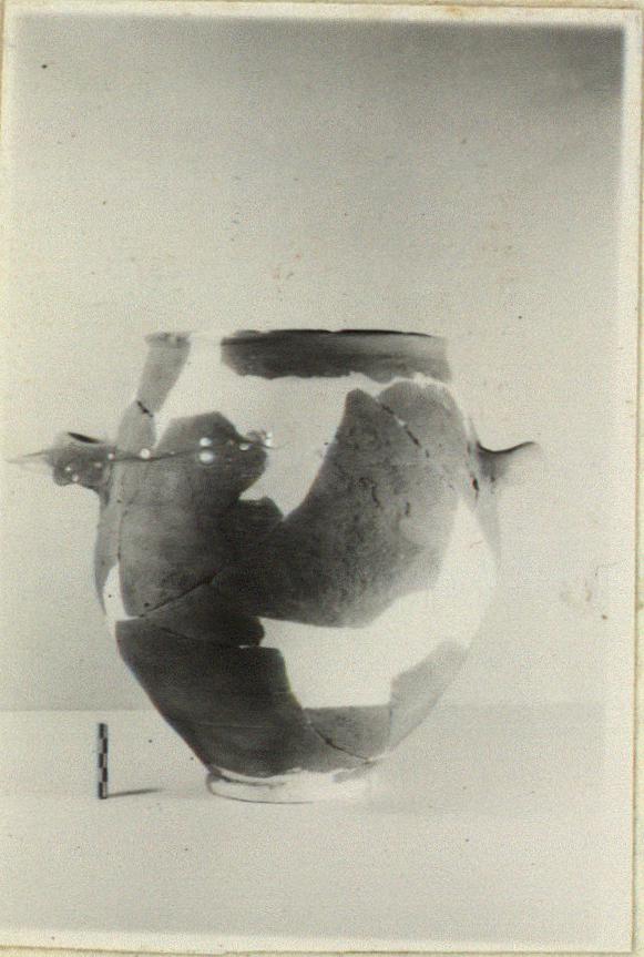 | Description: | Parts of rim, wall and foot missing; restored in plaster. Ring foot and deep rounded body; low point of greatest circumference. No neck; wide mouth with slightly projecting rim, flanged inside to hold lid. Horizontal band handles set well down; two grooves in the handle zone. Brownish red clay; unglazed; the surface very much worn. | |