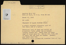 | Description: | A single fragment preserves part of the plain rim of a kylix. Exterior: part of head and shield of a warrior, left; added red on helmet largely rubbed off. Small dots on lower edge of crest (red?). Shield red, with row of small red(?) dots on border. Garment and beard also red. Interior: black glazed with reserved line at lip. | |