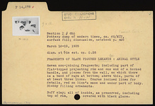 | Description: | Seven non-joining fragments; including part of flat-topped projecting rim and one end of a horned handle, and pieces from the wall, on which there is a band of rays at bottom; above this, parts of at least three lions. Coarse incised lines for details, red on lion's mane and underpart of body. Blobby filling ornaments. Buff clay; all of inside, as preserved, including top of rim, covered with black glaze. | |