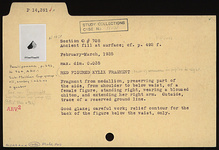 | Description: | Fragment from medallion, preserving part of the side, from shoulder to below waist, of a female figure standing right, wearing a bloused chiton and extending her right arm. Outside, trace of a reserved ground line. Good glaze; careful work; relief contour for the back of the figure below the waist, only. | |