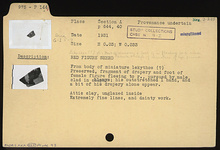 Description:   From body of miniature lekythos(?). Preserved, fragment of drapery and foot of female figure fleeing to right, pursued by male clad in chlamys; his outstretched left hand and a bit of his drapery alone appear.