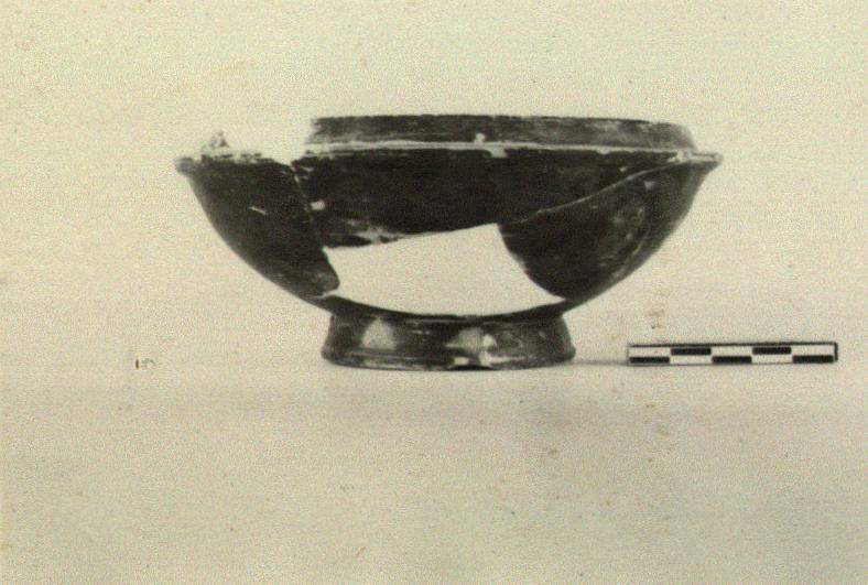 | Description: | About one-quarter of side missing. Restored in plaster. Base ring; rounded wall with slightly projecting rim; vertical flange inside for lid. Fair black glaze overall. | |
