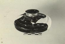 | Description: | Much of edge missing. Restored in plaster. Plain shallow conical lid with downturned edge and central knob, concave on top. Deep grooves at edge of top surface. Irregular rays in thinned clay on top; cross on knob. Fair black glaze. | |