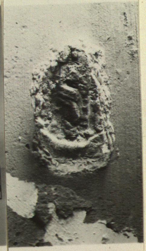 On side wall, just below rim, a lead seal rivetted through the clay.